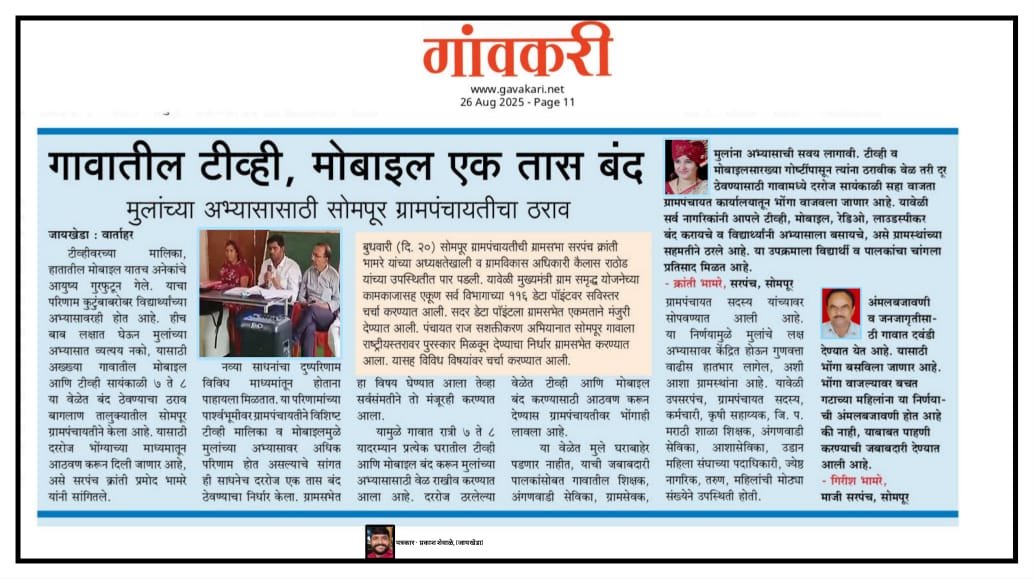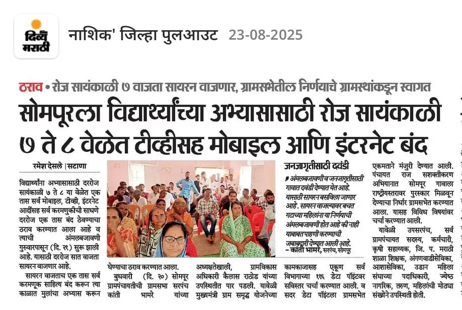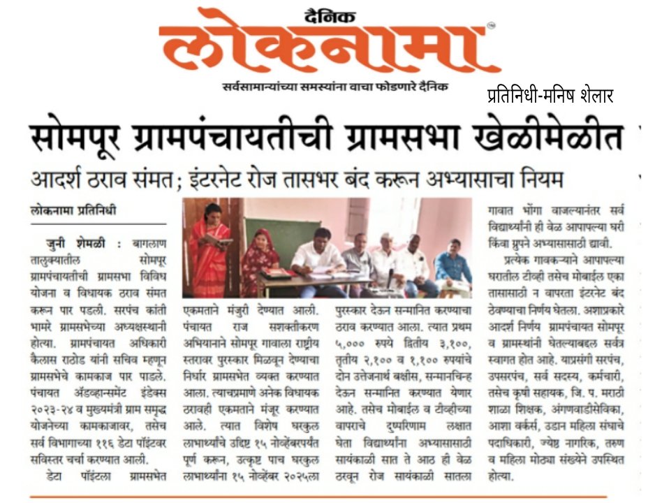 ग्रामपंचायत सोमपूर कडून लोकवर्गणीतून विद्यार्थ्यांसाठी अभ्यासिका तयार करण्याचे काम युद्ध पातळीवर सुरू झाले आहे त्याचे उद्घाटन आपल्या जिल्ह्याचे CEO माननीय श्री ओंकार पवार साहेब व उपमुख्य कार्यकारी अधिकारी माननीय श्री.महेश पाटील यांच्या हस्ते बुधवार दिनांक 26/11/25 यांच्या हस्ते संपन्न होत आहे. यासाठी विविध स्तरावरून मदत प्राप्त होत आहे. अजून बरेच काम अपूर्ण आहेत .तरी ज्यांना मदत करायची आहे त्यांना आवाहन करण्यात येते की त्वरित मदत पाठवावी.🙏🏻 सरपंच, उपसरपंच, ग्रामपंचायत अधिकारी, सदस्य, कर्मचारी ग्रामपंचायत सोमपूर. 1) आपल्या गावचे भूमिपुत्र उपमुख्य कार्यकारी अधिकारी जिल्हा परिषद नाशिक माननीय श्री महेश पाटील यांच्याकडून 15000 2) आमचे बंधू माननीय श्री सुधीर दादा भामरे यांच्याकडून अभ्यासिकेसाठी संपूर्ण फर्निचर 3) आपल्या गावचे भूमिपुत्र श्री नितीन चव्हाण यांच्याकडून अभ्यासिकेसाठी ट्यूबलाईट व फॅन 4) श्री. सुरेश गंगाधर भामरे यांच्याकडून 5000 5) श्री संभाजी भाऊराव भामरे यांच्याकडून 2100 6) प्रार्थमिक शिक्षक श्री नंदलाल सिताराम भामरे यांच्याकडून 2100 7)नासिक पंचायत समिती गटविकास अधिकारी माननीय सूर्यवंशी बाबा यांच्याकडून अभ्यासिकेसाठी पुस्तक उपलब्ध करून देण्यात येणार आहेत सर्वांचे ग्रामपंचायत सोमपुर तर्फे हार्दिक आभार🙏 धन्यवाद 🙏